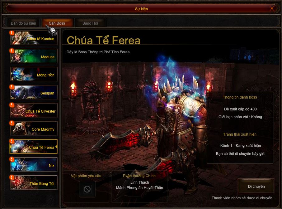 - Chúa tể Ferea sẽ xuất hiện tại bản đồ Phế tích Ferea. Khi Chúa Tể Fere hồi sinh sẽ hiển thị thông báo trên màn cửa sổ sự kiện, Mở Ctrl+T ấn Di Chuyển tự động đưa bạn đến đúng vị trí Boss Chúa tể Chúa Tể Fere.