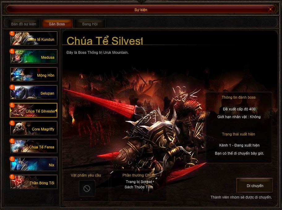 - Chúa tể Silvester sẽ xuất hiện tại bản đồ Urk Mountain. Khi Silvester hồi sinh sẽ hiển thị thông báo trên màn cửa sổ sự kiện, Mở Ctrl+T ấn Di Chuyển tự động đưa bạn đến đúng vị trí Boss Chúa tể Silvester.